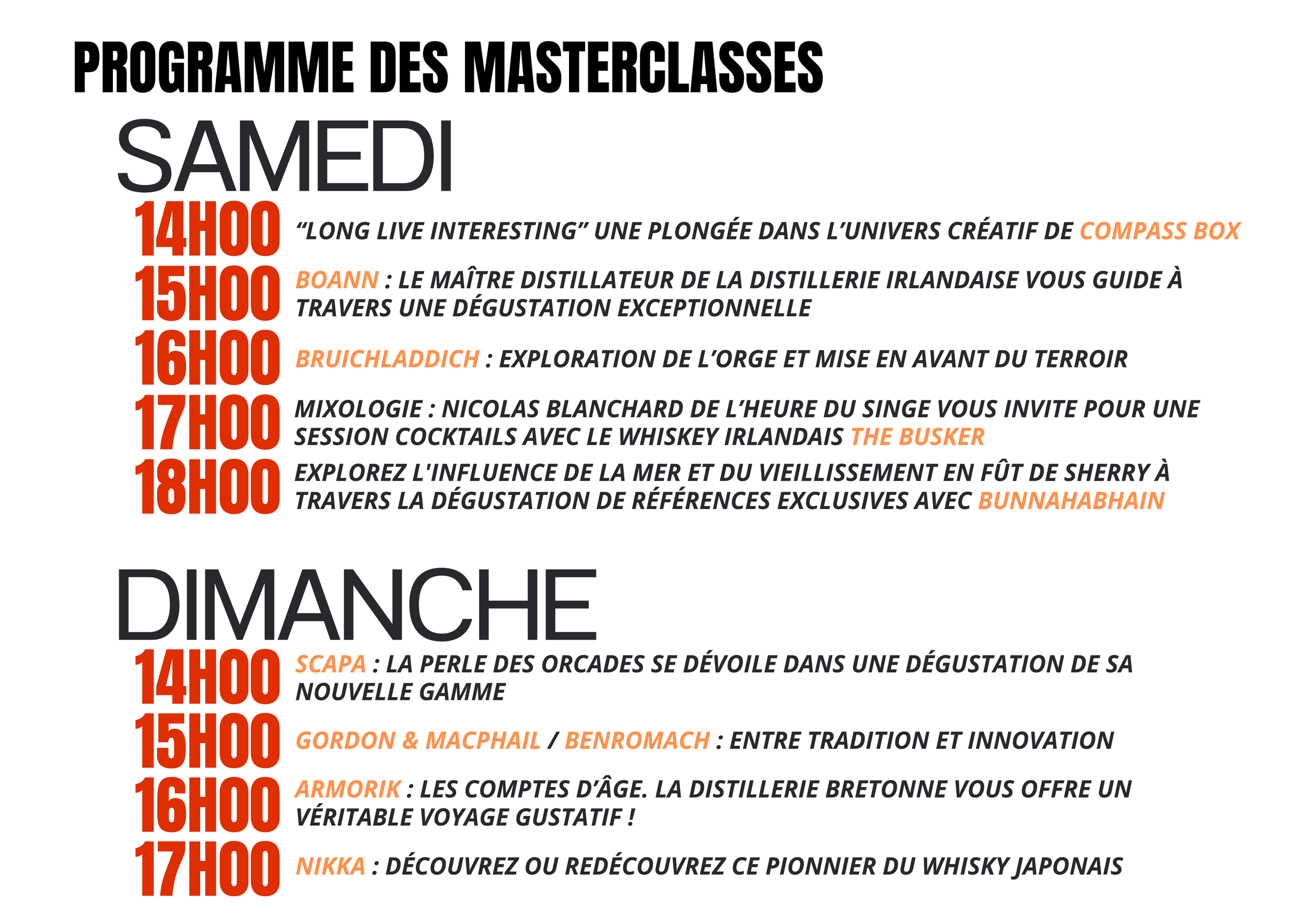 Chaque jour, un programme de masterclasses vous est proposé. Il s’agit de sessions de dégustation d’une durée de 45 minutes environ, en petit comité, autour d’un thème.